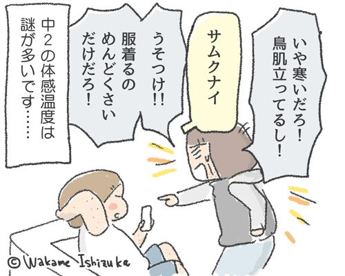 上着を着なさいってしょっちゅう言ってる。。この寒いなか。。