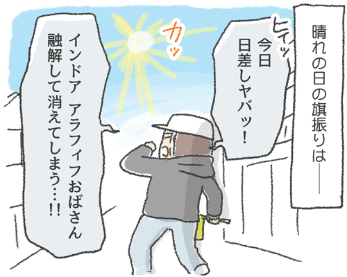 旗振りポイントは任意なのですが、たまたま朝日がギャンギャンに当たるところしか残っておらず、溶けるかと思いました。