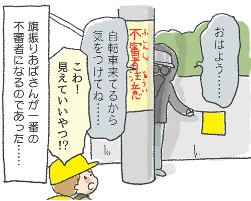 曇りの日も同じ場所に立ってるので、子どもたちが旗振りおばさんだと認識してくれてることを願うばかり……。